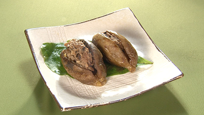 豚挽肉、しいたけ、味噌、酒、砂糖を混ぜ合わせる。 - アケビの皮にタネを詰める。
