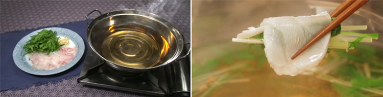 - 鍋に薄切りにしたクエをひたし、色が変わったらポン酢につけていただく。