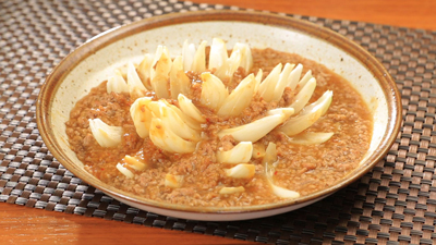 - 加熱した玉ねぎに麻婆のあんをかける。