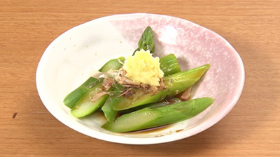材料 分量 ・ アスパラガス …1本 ・ だししょう油 …適量 ・ かつお節 …適量 ・ おろししょうが …適量