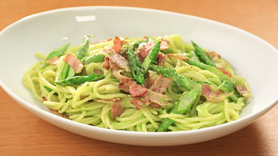 アスパラガスとベーコンを焼き目がつくまで炒める。 - 茹で上がったスパゲティ、アスパラ万能クリームを入れて絡める。