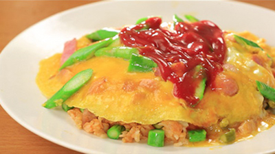 溶き卵を流し込み、半熟になるまで弱火で混ぜる。 - 皿に盛ったケチャップライスの上に卵をのせ、