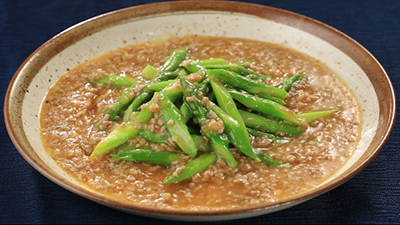 材料(4人分) 分量 ・ アスパラガス …6本 ・ サラダ油 …適量 ・ きざみにんにく …1かけ ・ きざみしょうが …1かけ ・ 豚挽き肉 …100g ・ 豆板醤 …小さじ1 ・ 砂糖 …小さじ1 ・ 鶏がらスープ …200mL