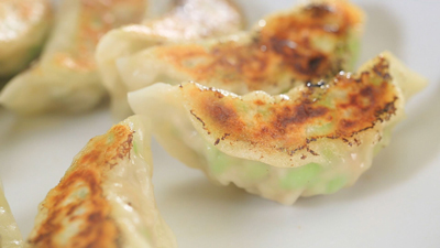 混ぜ合わせる。最後に残りの枝豆を入れて混ぜる。 - 餃子の皮にタネをのせて包む。