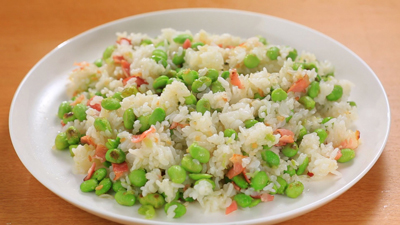 - 枝豆、ごはんを入れさらに炒め、塩で味を調える。