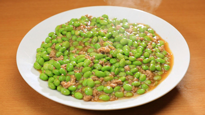 材料(4人分) 分量 ・ ゆで枝豆 …正味300g ・ 豚ひき肉 …150g ・ きざみにんにく …1片 ・ きざみしょうが …1片 ・ 酒 …大さじ2 ・ しょう油 …大さじ2 ・ 豆板醤 …小さじ1 ・ 砂糖 …小さじ2 ・ 鶏がらスープ …200mL ・ 水溶き片栗粉 …大さじ2 ・ ごま油 …適量
