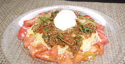 - パスタを皿に盛り、トマト、三陸海宝漬、温泉卵、刻んだ大葉をのせ