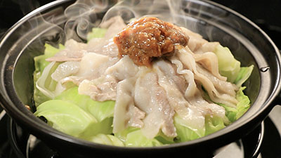 - タジン鍋にキャベツ、豚バラ肉、ほたての卵のおかず味噌をのせ、