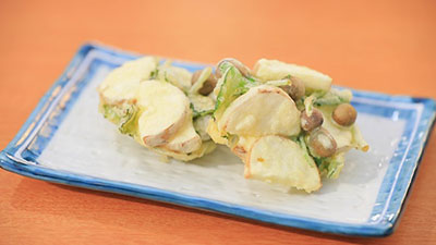 材料(3~4人分) 分量 ・ 自然薯 …50g ・ むかご …30g ・ 三つ葉 …10g ・ 天ぷら衣 …40g ・ サラダ油 …適量 ・ 塩 …適量