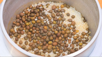 材料(5人分) 分量 ・ むかご …250g ・ 米 …5合 ・ 押し麦 …100g ・ 水 …900mL ・ 酒 …大さじ2.5 ・ 塩 …小さじ2.5 ・ 氷 …200g