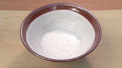 - 天ぷら衣に自然薯、むかご、三つ葉を加えて混ぜ合わせる。
