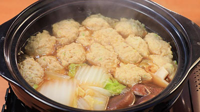 しいたけ、白菜を入れ沸騰させる。 - 鶏つみれを一口大にスプーンですくって落とし入れ、ふたをして5分ほど煮込む。