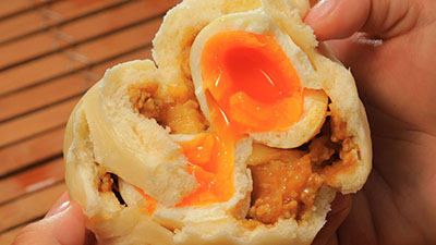 - 生地の真ん中にカレー、半熟卵を置いて包む。