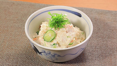 材料(2人分) 分量 ・ 里芋 …400g ・ きゅうり …1/2本 ・ 梅干し …2個 ・ 大葉 …2枚 ・ マヨネーズ …40g ・ 塩 …小さじ1/2 ・ コショウ …適量