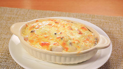 - グラタン皿にマカロニ、茹でた里芋を並べ、里芋ソースをかけて、