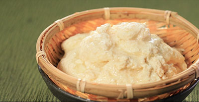 - 大豆の煮汁をこし布袋にあけて搾り、豆乳とおからに分ける。