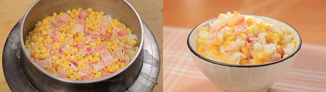 材料(4~6人分) 分量 ・ 米 …3合 ・ コーン缶 …1缶(コーン:約300g 汁:約140mL) ・ 牛乳 …300mL(コーン缶の水分量によって調整) ・ 酒 …大さじ3 ・ 塩 …小さじ1 ・ ベーコン …40g ・ バター …20g ・ 氷 …100g