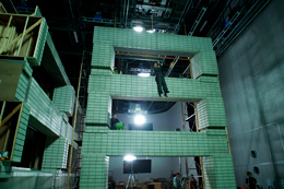 一見頭脳派の右京だが、今作ではその身体能力の高さを見せるシーンが。11階で起きた籠城事件の情報を得るため、13階からロープ1本で窓外を伝い降りるのだ。撮影はセットで行われ、プロの指導の下、安全ベルトを装着して万全の対策が取られてはいたが、なにせ建物3階分、10メートル近い高さを降りたり昇ったりすることになる。水谷は久々の吊りでの撮影に「下を見るとやっぱり怖いんですよ」と語っていたが、いざカチンコが鳴ると、華麗といっていい身のこなしでスルスルと昇り降り。「緊迫した物語の中でちょっとだけクスッと笑えるいいシーンになったと思います」と満足そうだった。