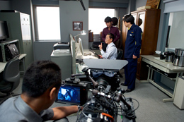 撮影クルーが訪れたのは、撮影も中盤に入った7月16日からの4日間。金曜日の県庁業務終了後から3連休中、現地スタッフやエキストラの万全の協力の下で撮影が進められた。広いロビーは、美術スタッフの丁寧な飾りこみで警視庁らしい佇まいとなり、俳優たちの味わい深い演技とあいまって映画ならではの奥行きのある画となっている。