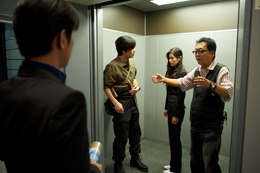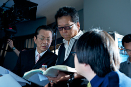 水谷豊演じる杉下右京と、その"相棒"である神戸尊を演じる及川光博がクランクインしたのは、その2日後、6月27日。いつものように特命係が上層部に呼び出された会議室のシーンだったが、今回はレギュラーの刑事部長・内村役の片桐竜次を筆頭に、籠城事件で人質となった各部の部長たちがずらり。國村隼、品川徹らベテラン俳優たちが居並ぶ画もまた、圧巻の一言だ。