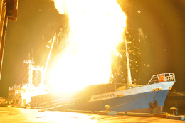 劇中、重要な意味を持つの爆破シーンは、日本国内では実現不可能な迫力を求めて、フィリピンまでロケに赴いた。「相棒」チームが前作やテレビシリーズで組み、抜群の信頼を寄せている現地のスタッフは、ハリウッド映画なども手がけるプロ中のプロ。港での船の大爆破という迫力のシーンを、爆破の規模、爆風の強さ、火柱の高さなどを計算しながら、テキパキとセッティングする。クレーンに乗せたりといろいろな角度から狙ったカメラ3台で収められた爆破の映像は、「スケジュールはキツかったですが、行った甲斐がありました」と今村勝範ラインプロデューサーも納得の出来だった。