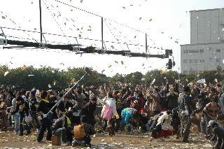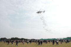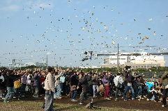 | まあとはいえやはり一番すごいのはヘリですよね。ヘリがあれだけ低空飛行するのはあまり見られるもんじゃないですし。想像はしていましたが、ヘリのローターから下向きに吹く風は並大抵ではありません。場所は船橋海浜公園の野球場で下が土になっているところもあり、そこでホバリングしたときには下から吹き返してくるものすごい風とともに砂と土が舞い上がるのです。 |