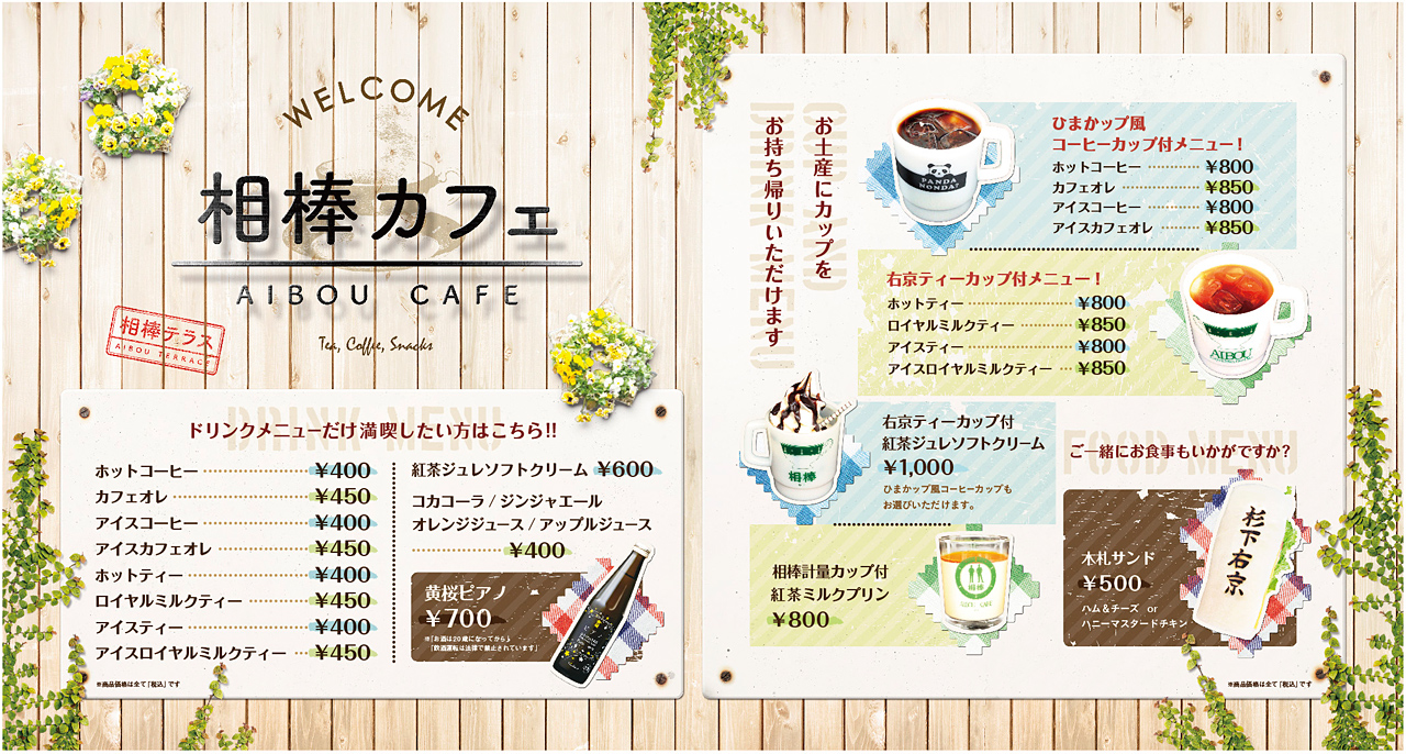 オリジナルのプラカップが持ち帰れる右京ティーカップ風紅茶や、ひまかップコーヒーを始め、右京サンドや紅茶プリンなどオリジナルメニューも。