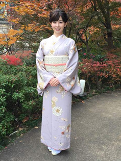 お着物は、やわらかな藤の地色に、菊、梅、桜など四季の花の文様が散りばめられていて、
