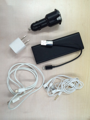 取材先でも充電できるように、シガーソケットとコンセントUSB充電器、充電済みのモバイルバッテリーは