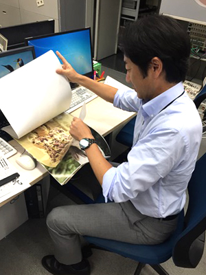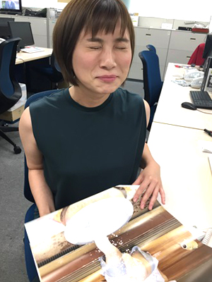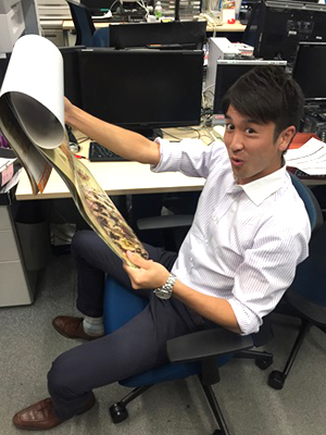 まずは、出来立てほやほやを男性アナウンサーに見せて