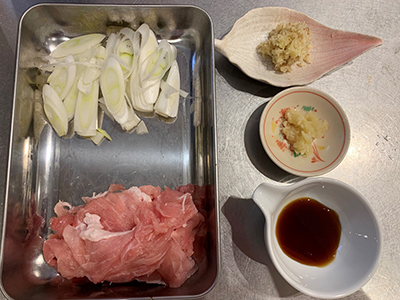 ③ 肉の色が変わったらしょうが大さじ1/2とにんにく小さじ1を入れます。
