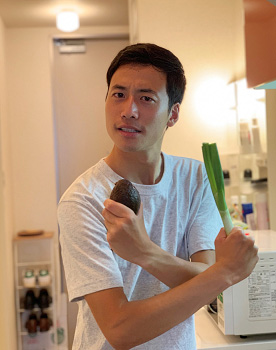 右手にはネギ、左手にはアボカドをもってやる気に満ち溢れています。
