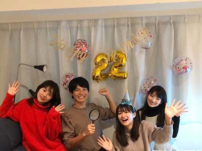 安藤が飾りつけ用にと風船をたくさん持ってきてくれたので、渡辺・安藤・佐々木の3人で協力して膨らませることになったのですが、なかなか思うように膨らませられず苦戦しているとその隣で余裕そうにどんどん風船を膨らませていく安藤の姿が……(笑)