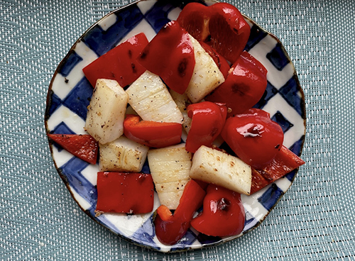 「赤と白」という見た目の色のインパクトはもちろんのこと、柔らかくふっくらとしたイカと、歯ごたえの残ったパプリカの食感、という味のコントラストも楽しめる一品です。