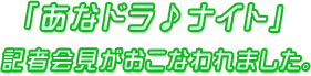 4月7日14時からテレビ朝日Aスタジオで「あなドラ♪ないと」の記者会見が行われました。 業界初、アナウンサーの主演ドラマ登場の記者会見とあって、60人を超える記者の方々が集まってくださいました。 下平アナ、野村アナ、そして龍円アナのそれぞれの感想を、司会の藤井暁アナウンサーがさらに面白くかき混ぜて、あちらこちらから笑いが漏れる楽しい記者会見となりました。 普段は見られないアナウンサーの魅力が満載、地上波とインターネットブロードバンドの両方で楽しめるマルチドラマ。 地上波は4月26日 深夜2時40分から3時35分 さあそれでは、記者会見の模様をお伝えしましょう。 |