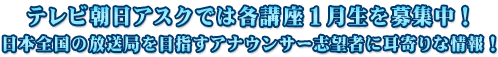 今年の冬もアスクで学ぶ皆さんが、狭き門に挑戦し続々と成果をあげています。今からでも遅くはありません。全国の放送局採用試験に最適の「就職セミナー短期特訓講座」をお勧めします。