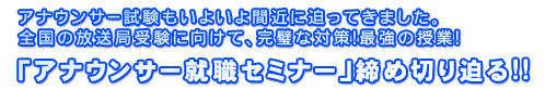テレビ朝日アスクの名物講座「アナウンサー就職セミナー」には、今年も全国から夢と希望に燃えた大学生が集い、連日テレビ朝日アナウンサーによる熱気あふれる授業が続いています。受講生の皆さんからは、興奮気味に喜びや感謝の気持ちを伝えてくれる声が今年も相次いでいます。 「こんなにたくさんの刺激を受けるとは思ってもいませんでした。」 「現役アナウンサーの皆さんの豊かな表情と発想に驚かされました!」 「目からウロコの3日間、勉強することばかりでした。」etc 中には、「やらなければいけないことが多すぎて、ちょっと憂鬱になりました・・・」という声もありましたが、同じ目標に向かって突き進む仲間達と出会い、「改めて頑張ろう!」とほとんどの皆さんが思ってくださっているようです。 今からでも遅くはありません! キー局の試験にもまだ十分間に合います!! やる気のある方、テレビ朝日アスクでお待ちしています。 |