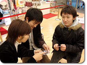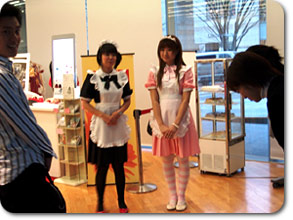 椿)そうですね、そう思われる方が多いんです。でもあそこ(六本木ヒルズ)はIT企業がたくさんあるでしょう? 矢島)そうですねぇ。今話題の企業がたくさんありますね。 椿)IT関連の人には萌え好きな方が多いんですよ。ですから、六本木にメイドカフェというのは意外でもないんです。アキバとは日比谷線だと一本でつながっていますし、仕事帰りにアキバへ!という人も多いと思います。 久保田)萌え好きねぇ…。 矢島)なるほど…。わかったようなわからないような(笑) 中村)難しいなぁ。 久保田)さっきから気になってたんですけど、入り口のガラス窓に張り付いて見ている方がさっきからたくさんいらっしゃいますもんね。 矢島)本当だ!確かに最初はちょっと抵抗ありますね。 |
