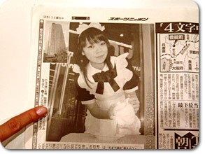 矢島)土日にはイベントがあるんだそうですね。 椿)はい。毎週末イベントがあるときには、萌え好きな方々がたくさんいらっしゃってくださいます。でも平日はガラッと客層が変わるんですよ。ここはお洒落な街、六本木。萌え目当てでくるわけではないんで最初は皆さんびっくりされています。カップルは女性が興味津々なのに、男性がためらっているなんてケースが多いみたいですね(笑) 久保田)メディアも放っておかないのでは? 椿)えぇ、そうなんです。おかげさまで、新聞や、ブログなどでも紹介していただけることが多いんですよ。先日はスポーツニッポンさんに、今度は朝日新聞さんに取材していただける予定です。 中村)すごい注目度ですね。 椿)これがその記事です。 |