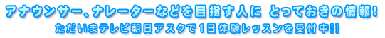 それぞれ皆さんの思いは違うでしょうが、ただいまテレビ朝日アスクではそんな皆さんの最初の一歩、1日体験レッスンを受け付けています。どんなことを教えてくれるのか、どんな授業が行われているのか。プロのしゃべりを見て聞いて感じることのできる、この絶好の機会。是非一度ドキドキ体験して下さい!