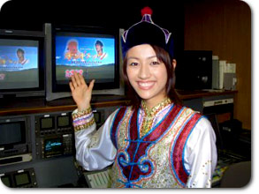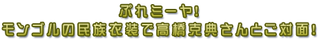 今週の『ぷれミーヤ』では、 18日(土)放送の「チンギス・ハン」をご紹介いたします! それにちなんで、 番組のナビゲーターで、先月モンゴルを訪れていた高橋克典さんのところへ インタビューに行きました。 実は、偶然にも私も高校時代にモンゴルにいったことがあるということで 番組スタッフがモンゴルの民族衣装を用意してくださいました。 「モンゴルの雰囲気をかもし出して、 高橋さんからモンゴルの体験談をめいいっぱい引き出してこいっ!」と指令を受けて、 いざ突撃!!! |