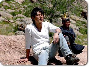 高橋さんの待つ部屋に入るやいなや、 「サインバイノー!」(モンゴル語で“こんにちは!”) と挨拶をしてみました。 すると、高橋さんは、 「あっはっは!サインバイノー!」 流暢なモンゴル語で、しかも爽やかな笑顔でお返事してくださいました。 高橋克典さん、気さくなお方でした。 インタビューでは、モンゴルでの食事や、遊牧民の暮らし、チンギス・ハンの生き方など、 様々なお話を伺いました。 食事では羊肉を気に入ってしまい、日本に帰ってきてからも家で焼いて食べられたそうです。 高橋さんは、2週間の滞在の中で、モンゴルに魅了されたようでした。 話しの最後には、「是非、家族でまた行ってみたいです。」と笑顔で語っていました。 |