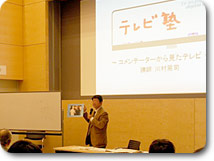 「テレビをもっと身近に感じて欲しい」 そんな気持ちを胸にテレビ朝日が新たにこんな企画をスタートさせました♪ テレビ朝日はこれまでにも、 小学5年生から大学生の皆さんへの情報・総合学習支援として 「館内見学」や、社員が学校に訪問して授業を行う「出前授業@テレ朝」を企画し、 テレビ局の仕事やニュースが出来るまでを知っていただける場を作ってきました。 そして! 今回、さらに多くの方々との出会いの場として、 18歳以上の視聴者の皆さんを対象とした新企画「テレビ塾」を開講することになりました。 この「テレビ塾」では、 ニュース・バラエティ・ドラマ・スポーツなどテレビ制作のあれこれをはじめ、 テレビ局の様々な仕事・仕組みについて、 毎回テーマを決めてテレビ朝日社員が皆さまにわかりやすくお話しします。 一回目は「やじうまプラス」や「ワイドスクランブル」「スーパーJチャンネル」などでおなじみ、 テレビ朝日コメンテーター 川村晃司さんが「コメンテーターから見たテレビ」について講演。 |