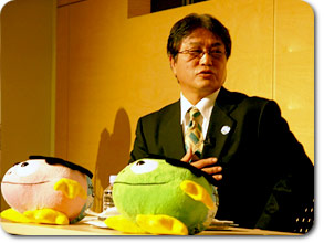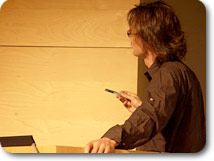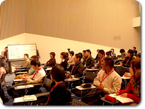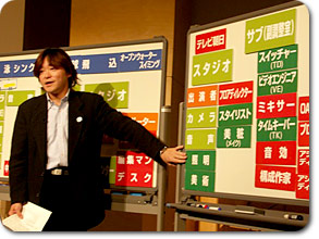 二回目は3月18日から始まる「世界水泳メルボルン」を前に、 「2001年世界水泳福岡」から現在まで、 水泳番組全てにたずさわり制作を担当してきた篠原弘光プロデューサーが、 「世界水泳ができるまで」について講演。 ホワイトボードを使って本格的な(?)講義が始まりました。 |
