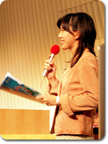 講師のほかにゲストが登場! スポーツ実況といえばわがアナウンス部の森下桂吉アナウンサー。 世界水泳をはじめ、オリンピックやフィギュアスケートの時の 実況中継の裏話などを話してくれました。 |
