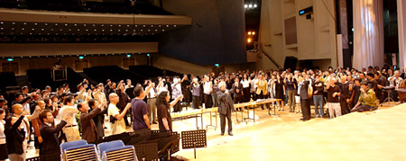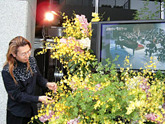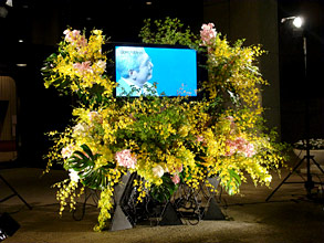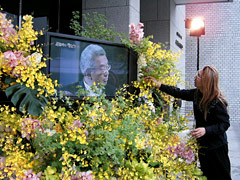 ![]() ![]() 会場エントランスには華道家・假屋崎省吾さん自らが飾られたお花が ![]() 演奏後、全員で献杯 |