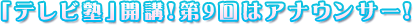 あけましておめでとうございます! 今年もテレビ朝日アナウンス部をよろしくお願いいたします。 さて、本日は耳寄りなお知らせ。 テレビ朝日では、テレビ局の様々な仕事・仕組みをテレビ朝日社員が 皆様に分かりやすく説明する「テレビ塾」を定期的に開講しています。 その第9回は、「アナウンサーの仕事」。 いよいよ我々アナウンサーの出番です!! 普段、アナウンサーはどんな仕事をしているのか? あのおなじみの番組の舞台裏は? 興味のある方は 下記のページで、左上にある「テレビ塾」をクリックしてください。 http://www.tv-asahi.co.jp/hq/ 日時 1月24日(木) 16:00〜 場所 テレビ朝日本社内2F プレゼンルーム 資格 18歳以上の方ならどなたでも 定員 80名(応募多数の場合は抽選) 締切 1月15日(火) |