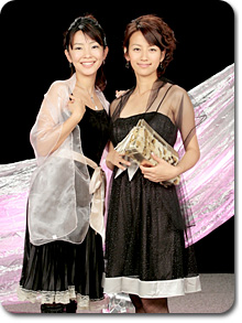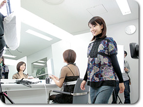 先に着替えを終えた前田が、 ドラえもんポーチを使って、メイクをしています。 そこに私服の私が、入ってくる…。 メイクをしてパーティーファッションに着替えた2人は、 スチール撮影に臨むのです。 |