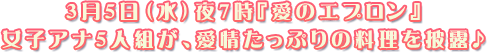 5人娘の精一杯の頑張り、伝わったでしょうか? 3月5日(水)『愛のエプロン』は夜7時からです。 ぜひご覧になってください☆ |