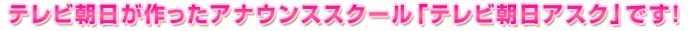テレビ朝日が、優秀なプロのアナウンサーや声優を育てるために1999年にテレビ朝日が100%出資して設立した学校です。 その後、話し方教室、朗読教室、ナレーター養成、さらに放送作家養成コース、気象予報士養成コースも設置し、初年度から優秀な卒業生を送り出しています。・・・アスクTOPページより